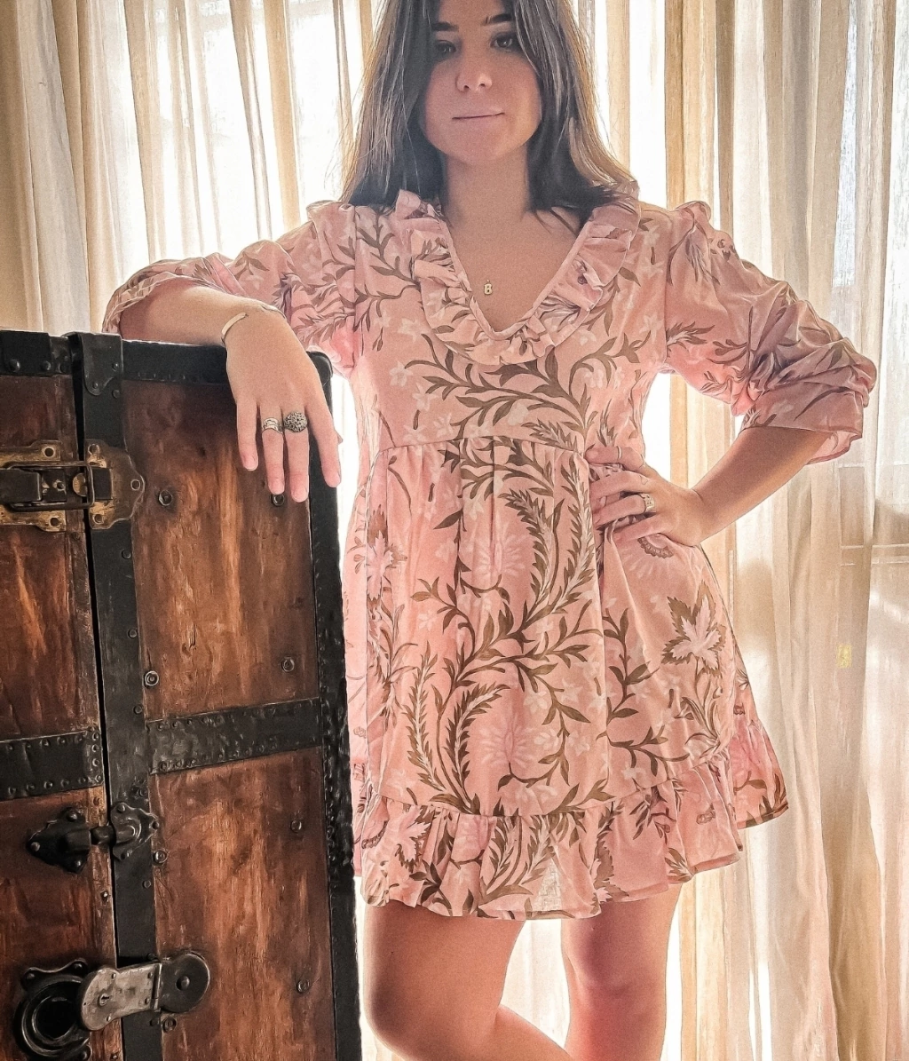 Vestido corto con un escote con volados en V que resaltan el cuello y aportan un toque romántico. Tiene mangas largas con elástico en el puño que generan un volado, ofreciendo mayor confort. Posee una costura en V invetida debajo del pecho, que marca la silueta formando una falda amplia con volados en la parte inferior. Es un vestido versátil que transmite libertad y estilo, parte de la cápsula "Morrison", hecha en Argentina y atemporal.
