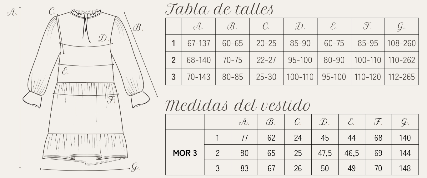Nuestros talles abarcan dos convencionales, representando el talle 1 a S/M, el 2 a M/L y el 3 a L/XL. Las medidas son expresadas en centímetros (cm). La tabla de talles corresponde a las medidas del cuerpo, las medidas del vestido a la prenda en plano.