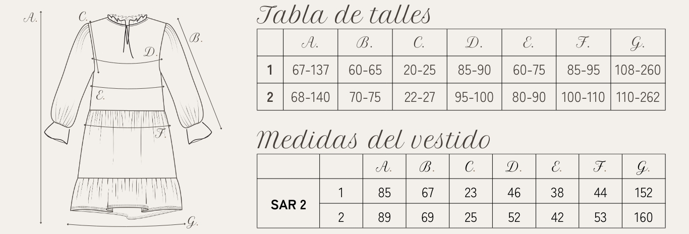 Nuestros talles abarcan dos convencionales, representando el talle 1 a S/M y el 2 a M/L. Las medidas son expresadas en centímetros (cm). La tabla de talles corresponde a las medidas del cuerpo, las medidas del vestido a la prenda en plano.
