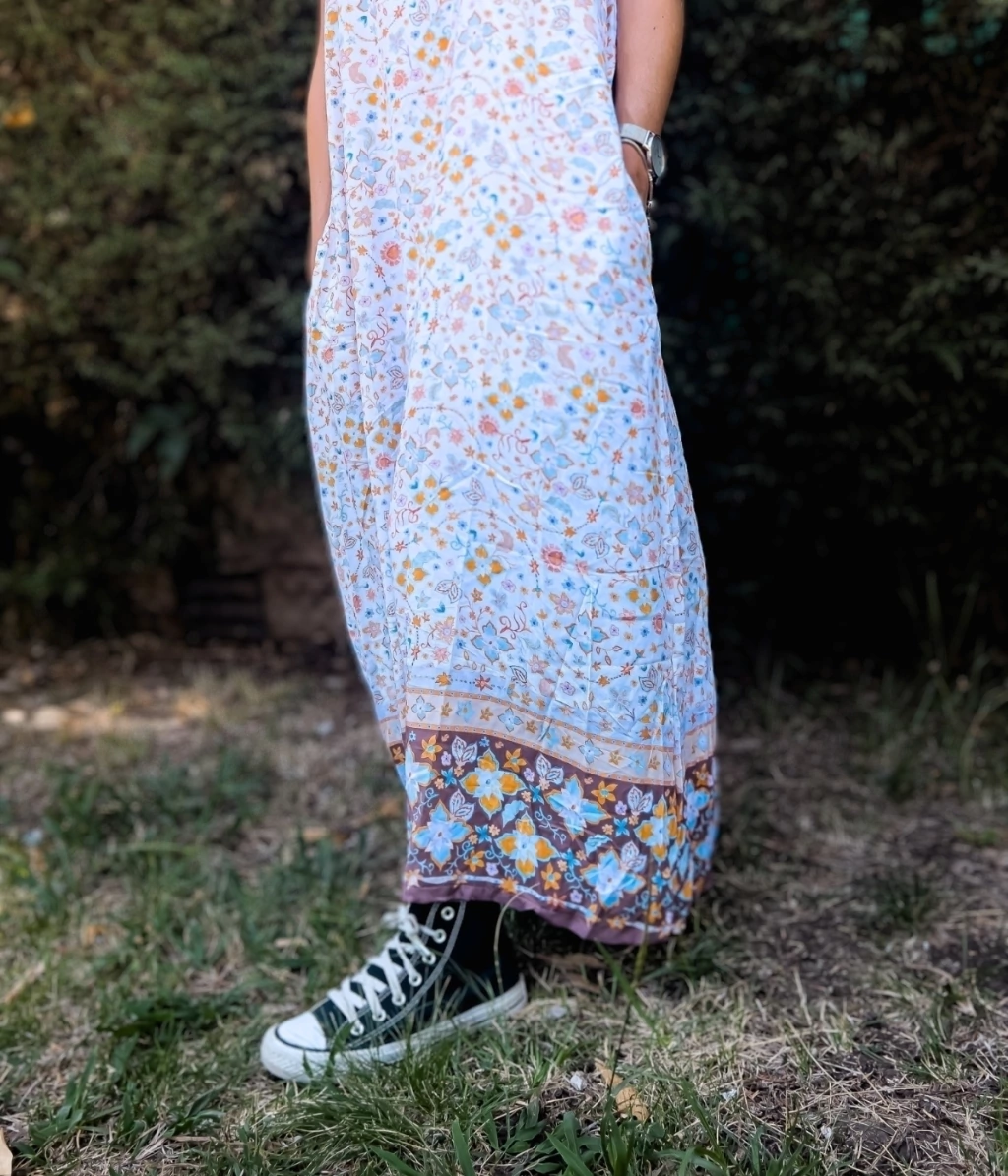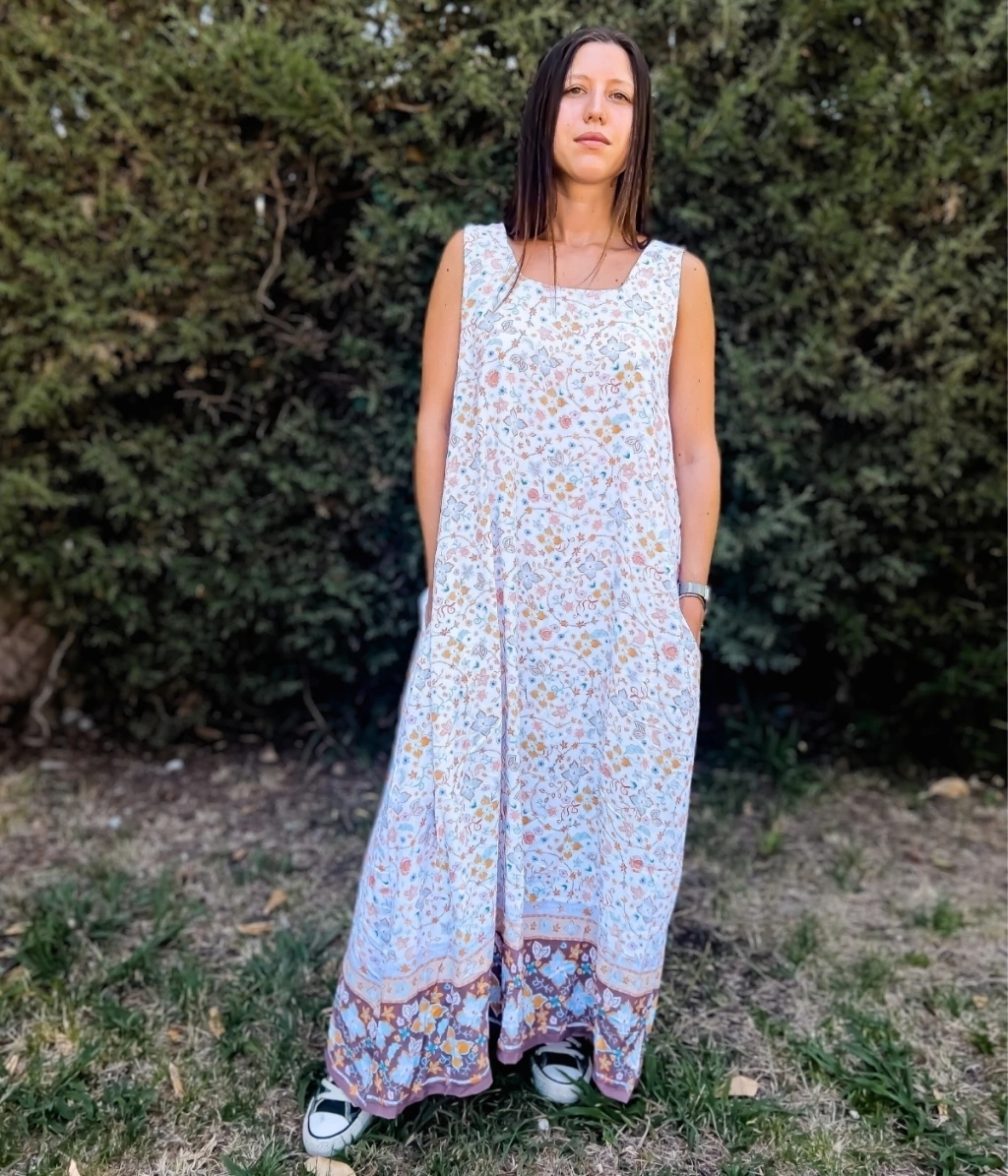 El SAR 4 es un vestido largo, suelto, bien cómodo por sus bolsillos. Ideal para cualquier ocasión y para combinar en capas. De la cápsula "Sarachaga".