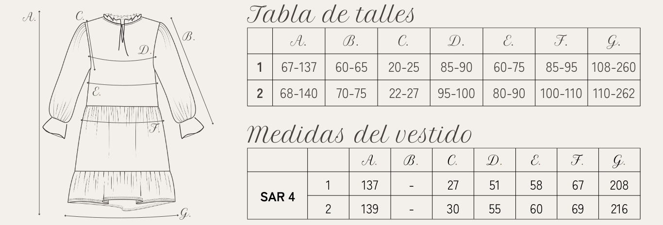 Nuestros talles abarcan dos convencionales, representando el talle 1 a S/M y el 2 a M/L. Las medidas son expresadas en centímetros (cm). La tabla de talles corresponde a las medidas del cuerpo, las medidas del vestido a la prenda en plano.